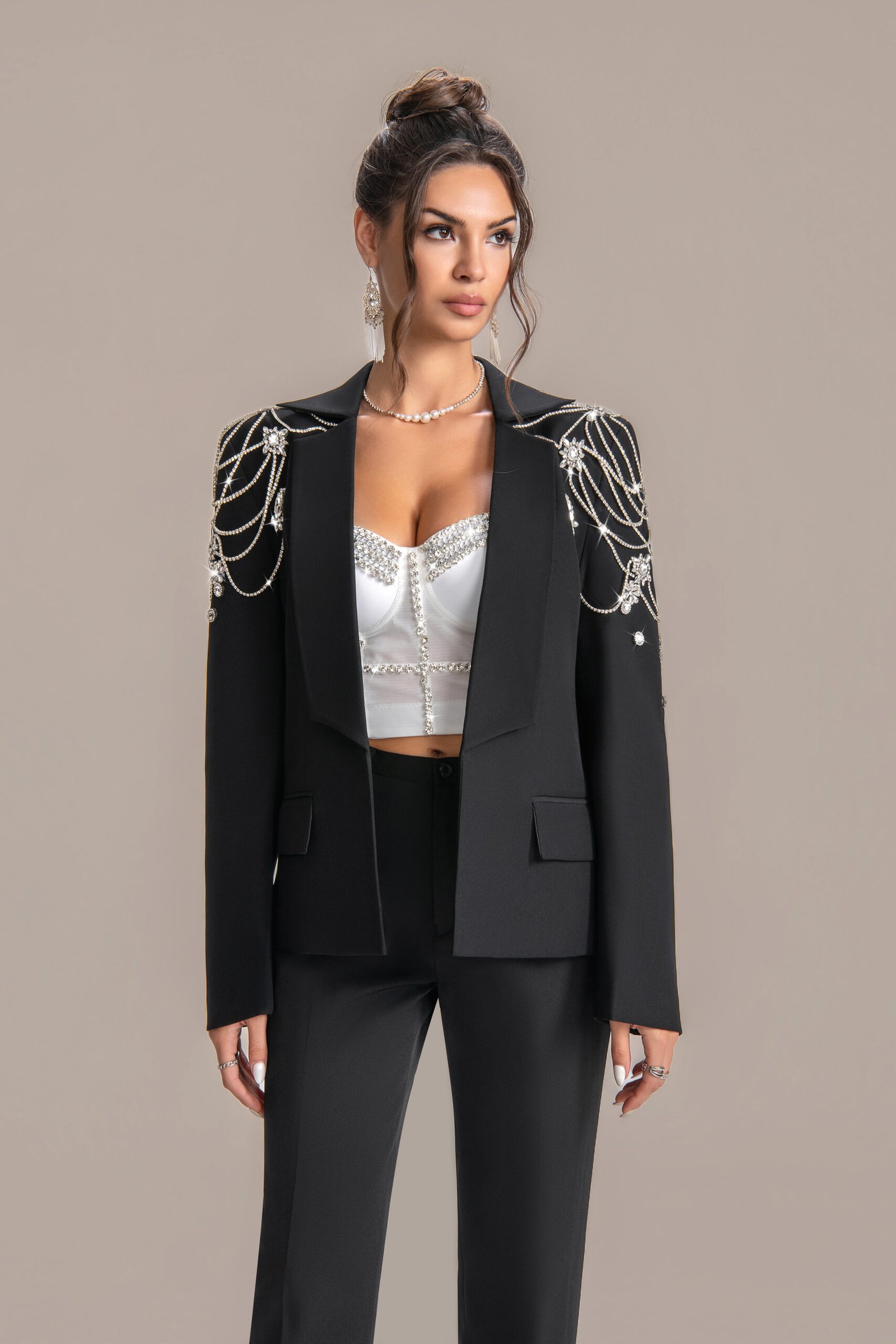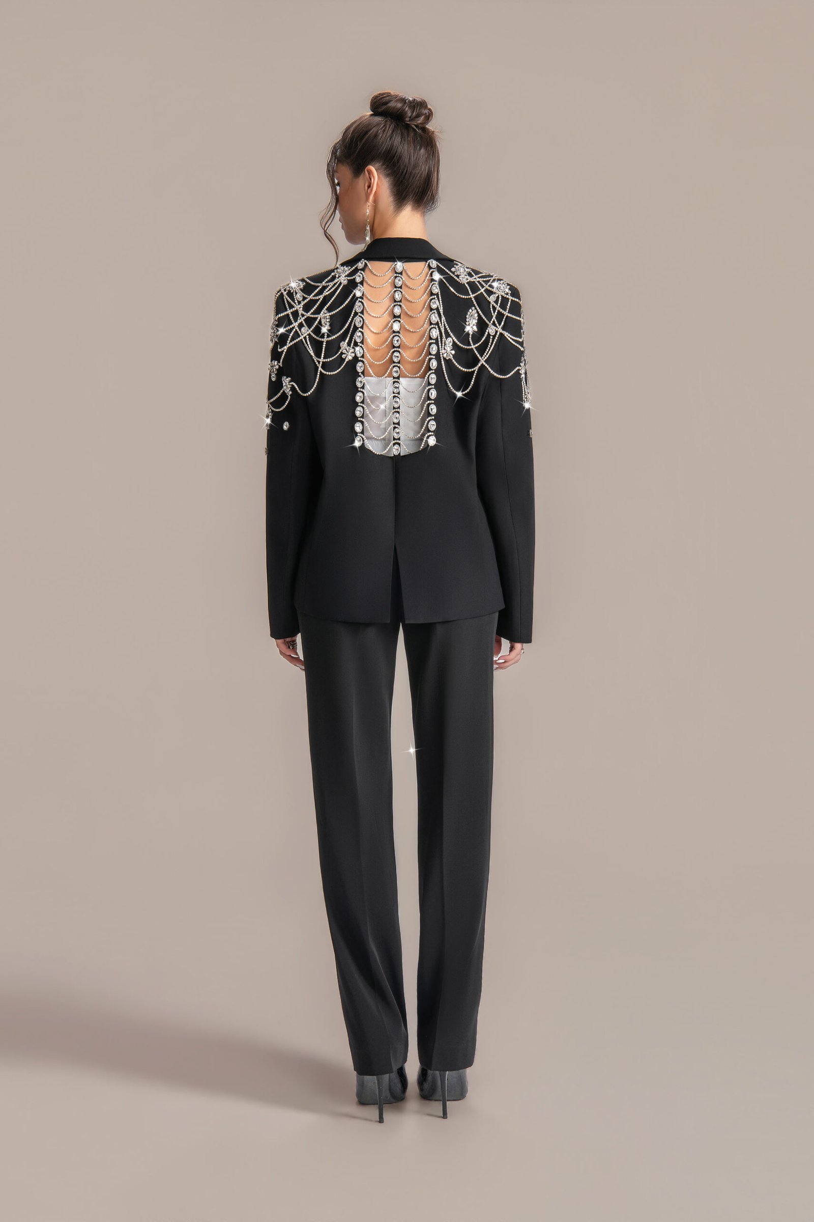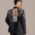 Description: Statement black blazer with hand-embroidered crystal chain web back detailing. Customizable fit, premium fabric, ideal for red carpets, galas, and high-profile events.