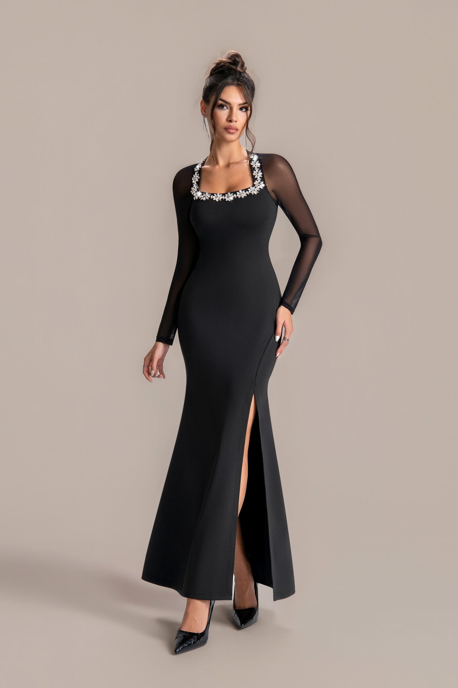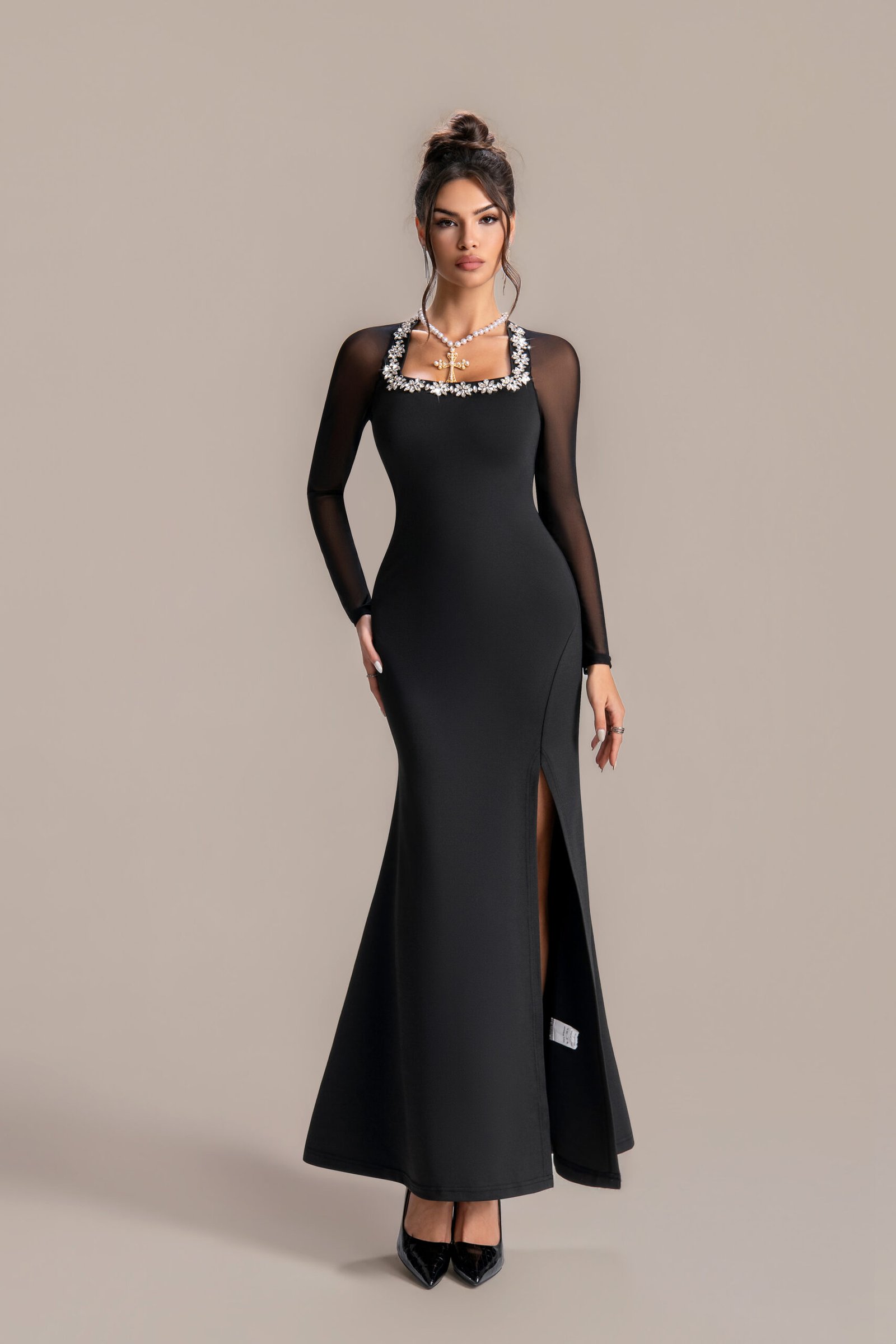Designed with versatility in mind, this dress pairs effortlessly with minimalist heels, a small clutch, and delicate jewelry to let the diamonds take center stage. From evening soirees to black-tie events, this gown is your go-to choice for making a memorable impression. Embrace timeless beauty with a hint of glamour—this black diamond dress is more than an outfit; it’s a statement of confidence and elegance.