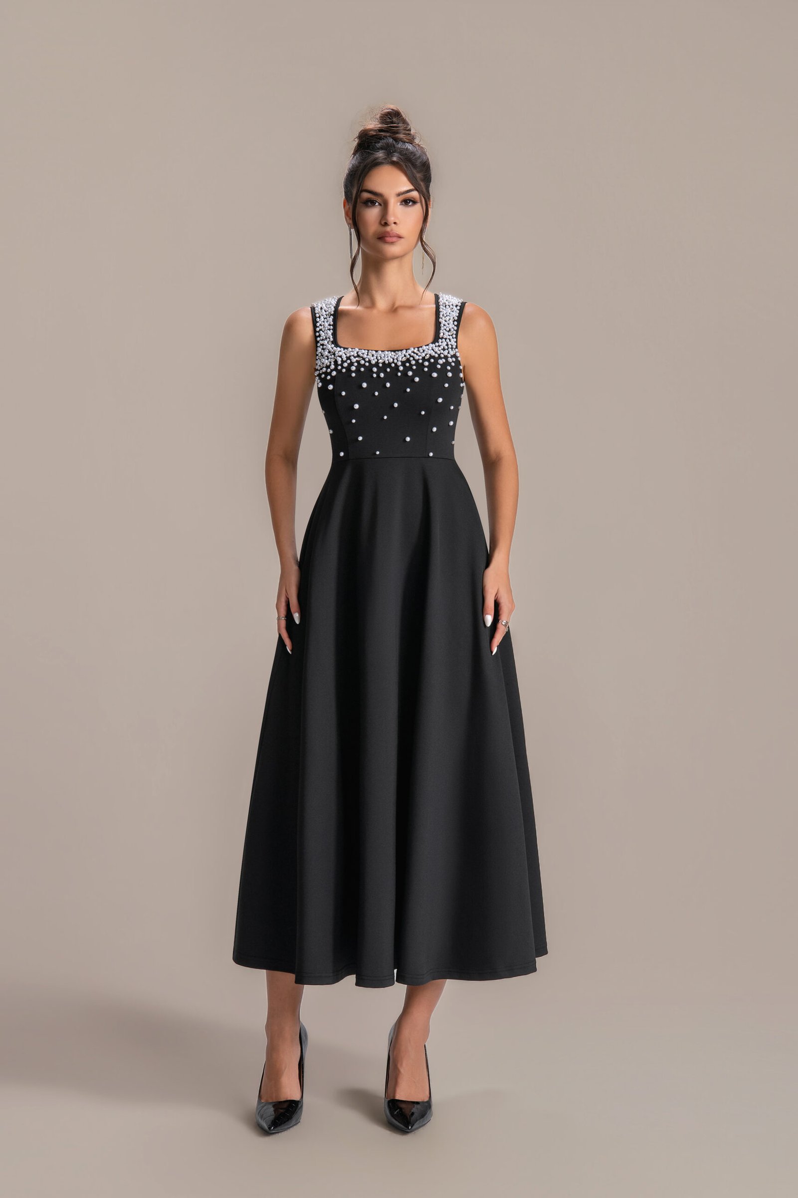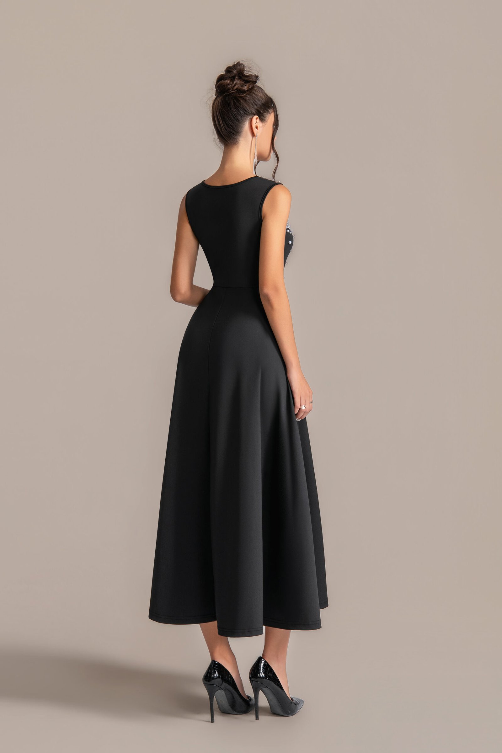 The rich, opaque black fabric hugs the body through the torso, transitioning into a dramatic mermaid skirt that flares gently from the knees—creating a striking hourglass silhouette. Designed with a sleeveless cut, it highlights the shoulders and collarbone, while the hand-sewn crystal diamonds along the neckline deliver a dazzling focal point. The crystals catch light from every angle, adding subtle luxury without overwhelming the gown’s elegant simplicity. Crafted from a soft, stretchy satin-blend, it offers all-night comfort, letting you move with grace whether dancing or mingling.