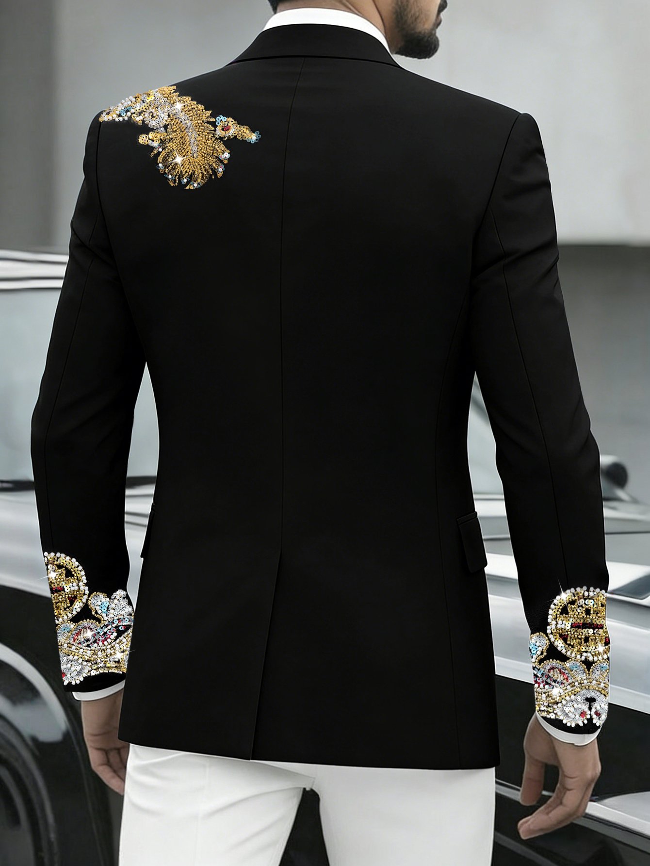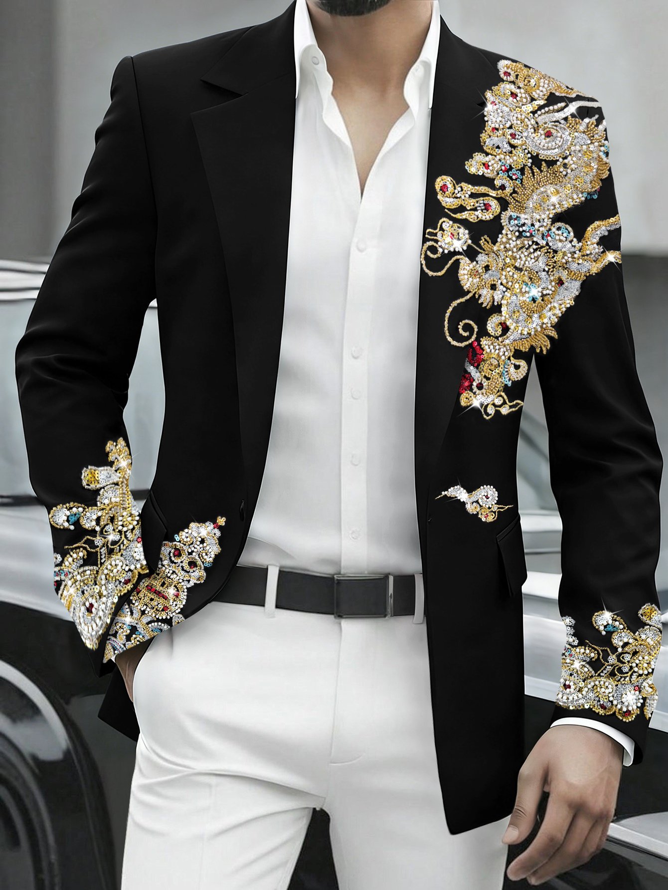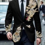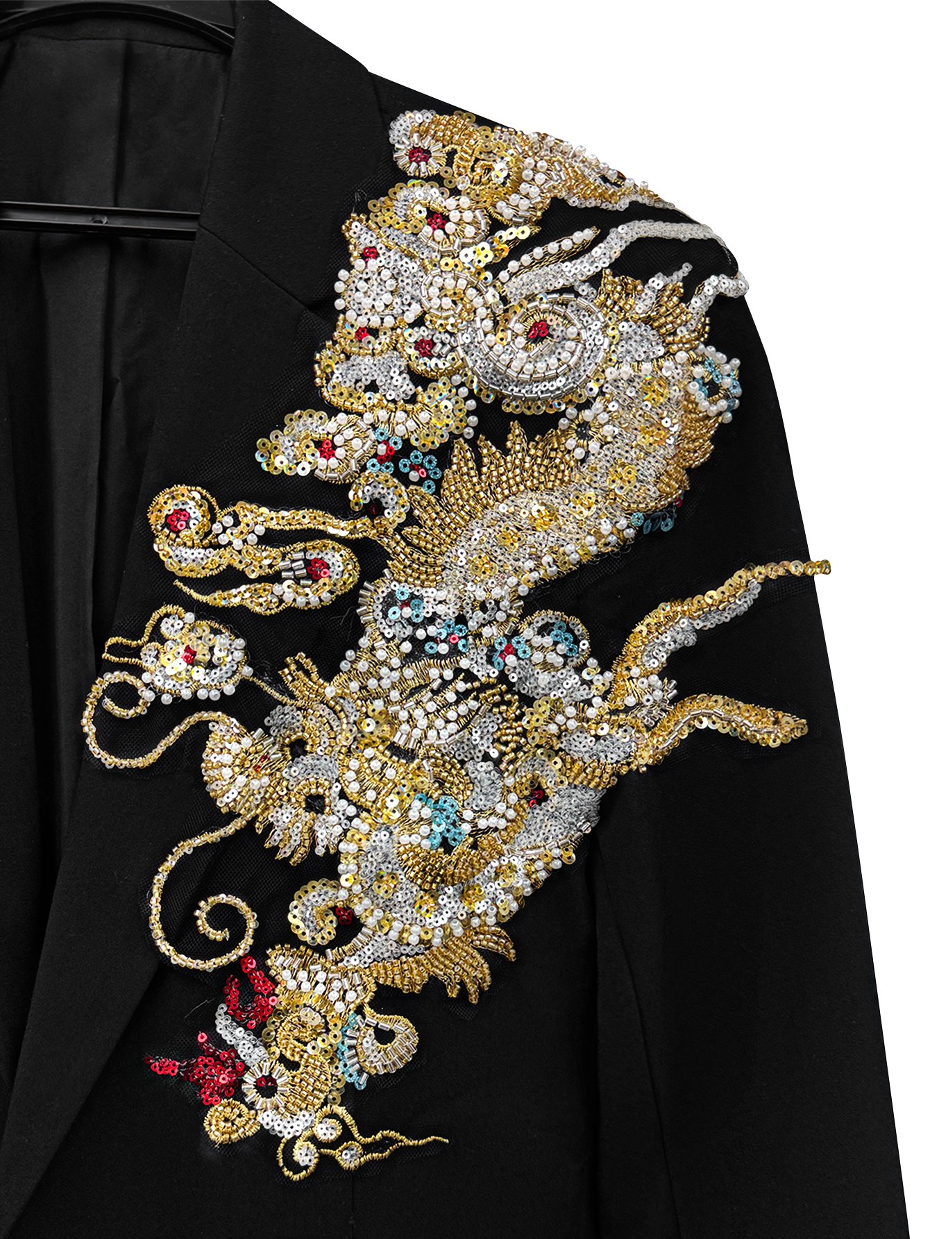 Exquisite Dragon Embroidery: Handcrafted golden dragon patterns adorn the blazer (collar, cuffs, or chest), symbolizing nobility, power, and oriental charm. The 3D embroidery with metallic gold threads adds a stunning glossy finish, making you stand out in any occasion.