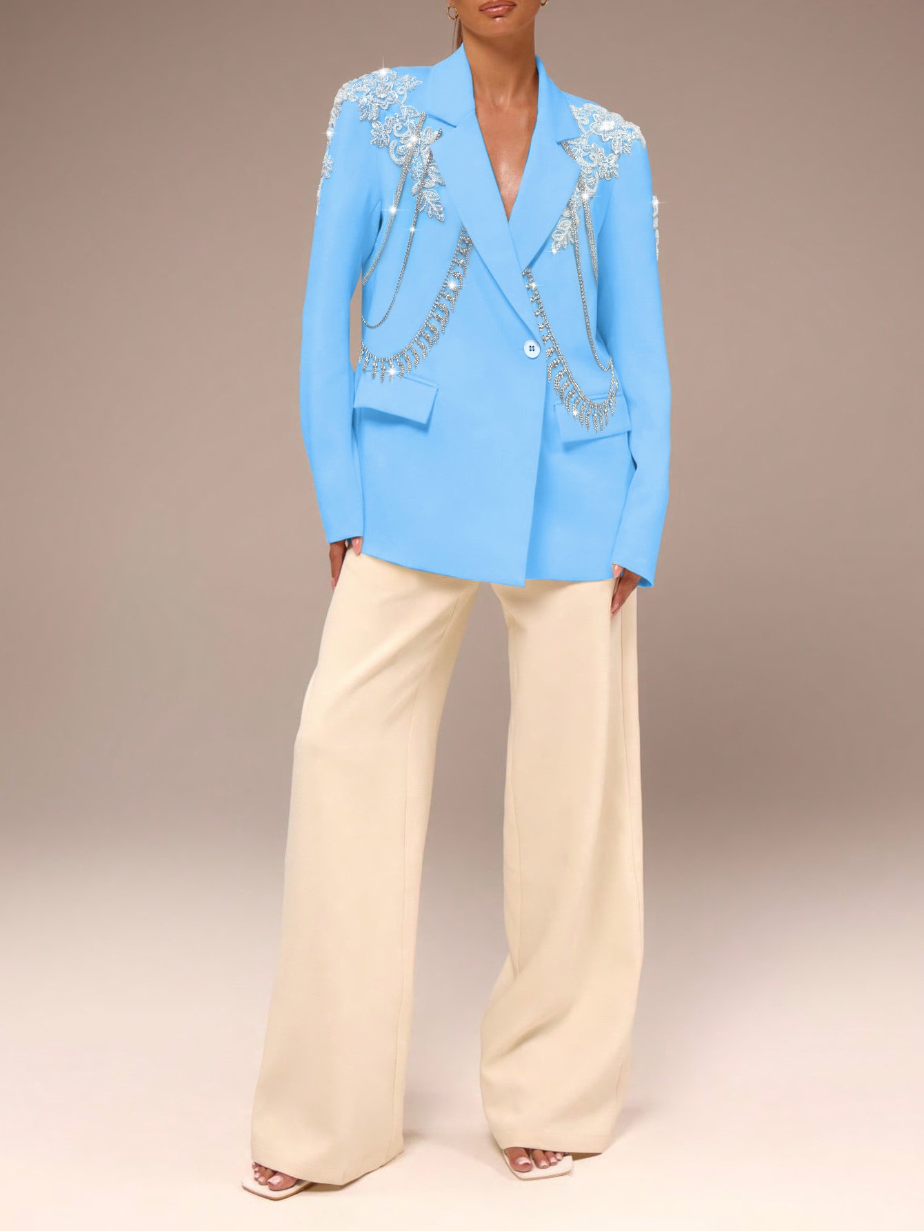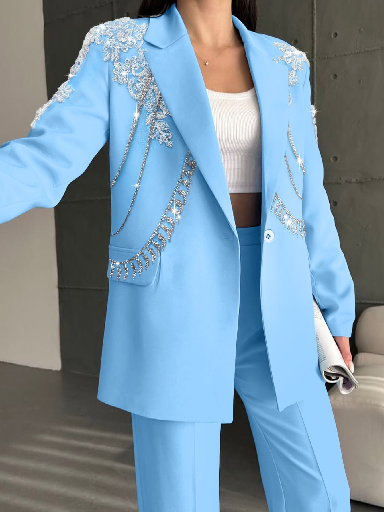 Crafted from high-quality, breathable fabric, the blazer offers a slim yet comfortable fit that flatters all body types. The rich royal blue hue exudes confidence and luxury, making it a versatile statement piece that pairs seamlessly with dress pants, jeans, skirts, or dresses. The detachable diamond chain (adorned with sparkling cubic zirconia stones) and精致 tassel details are strategically placed to enhance the blazer’s silhouette, adding movement and shine without overwhelming the design.
