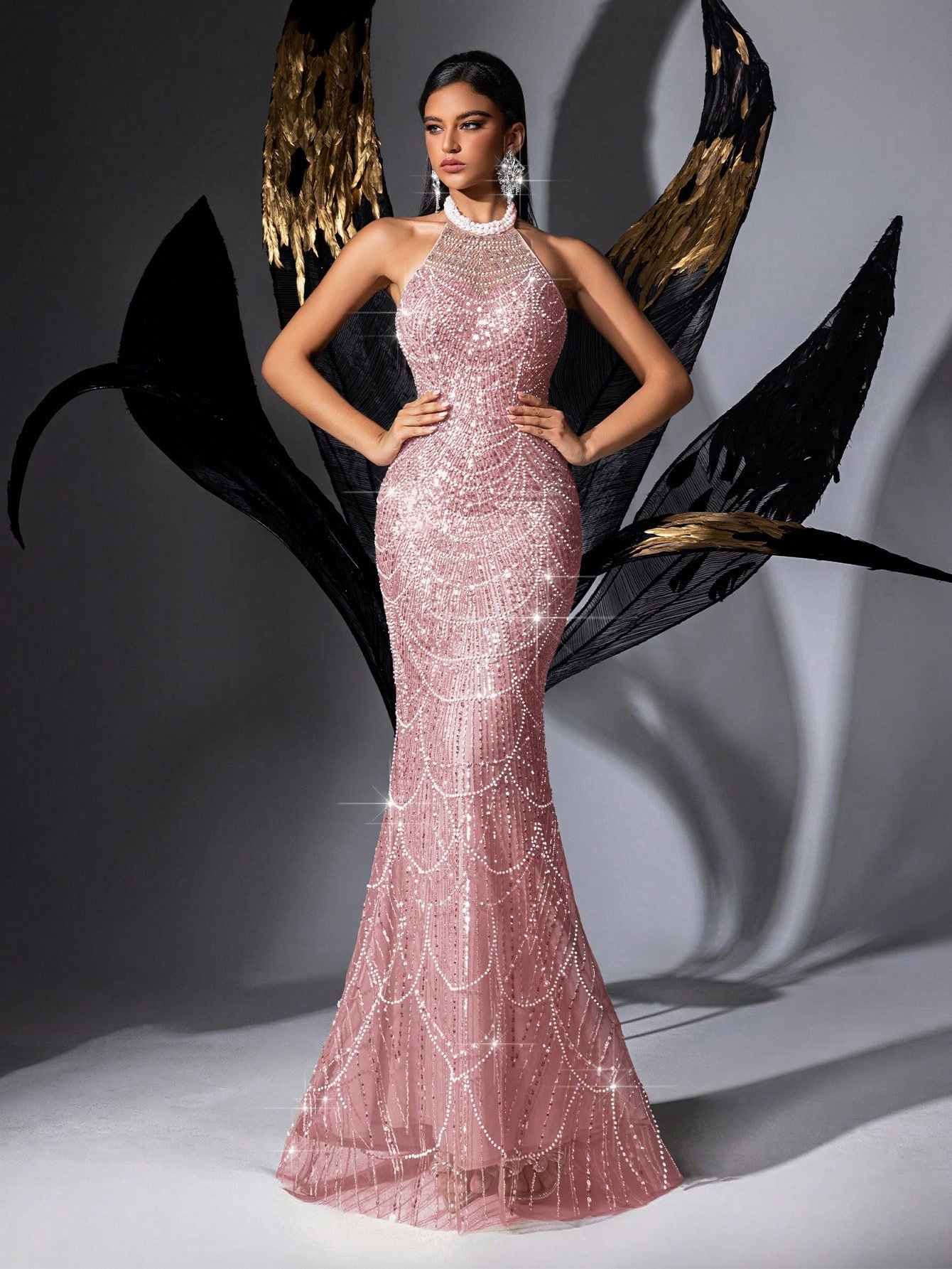 Custom High-End Floor-Length Pink Diamond Dress with Pearl Choker