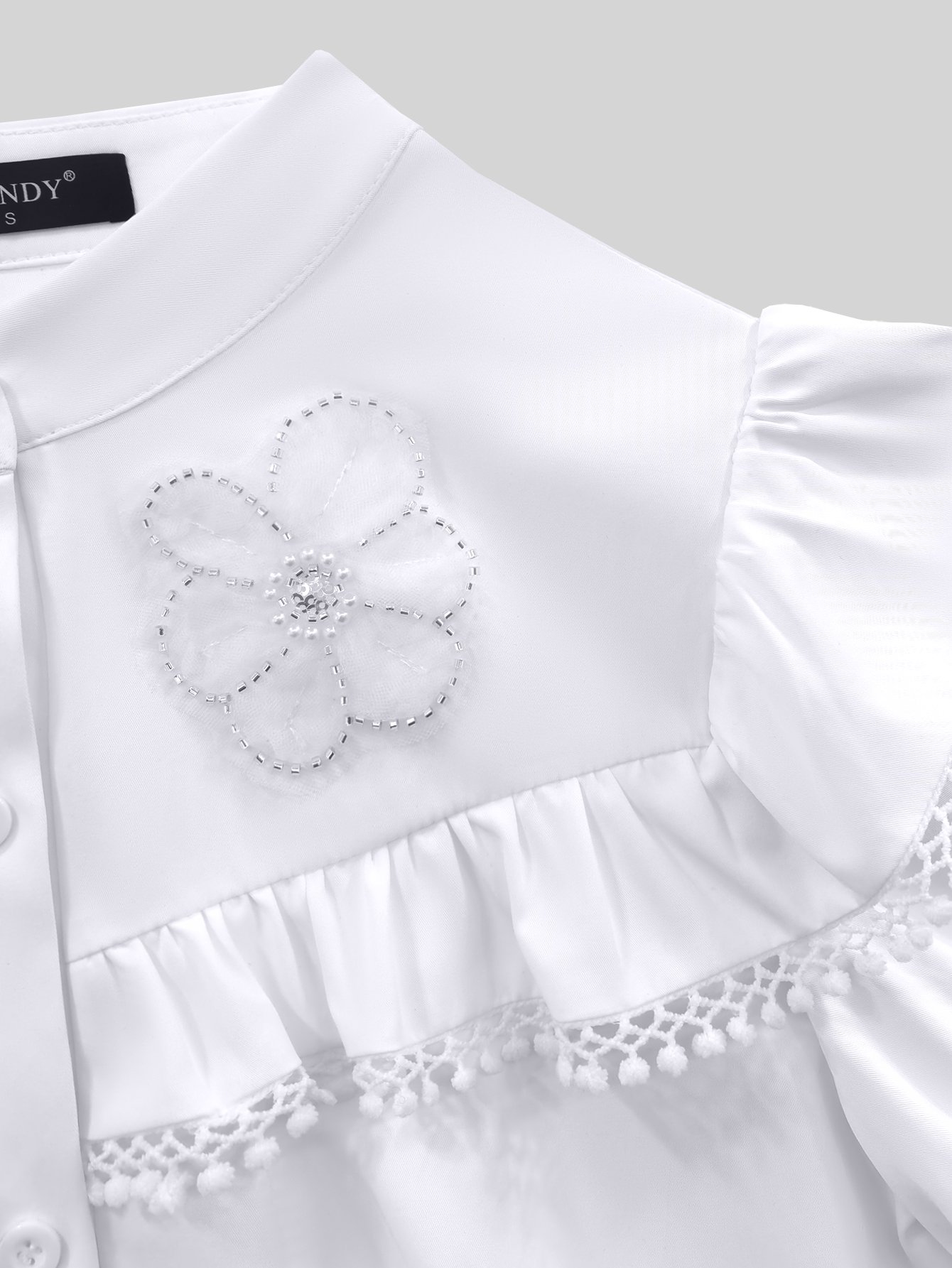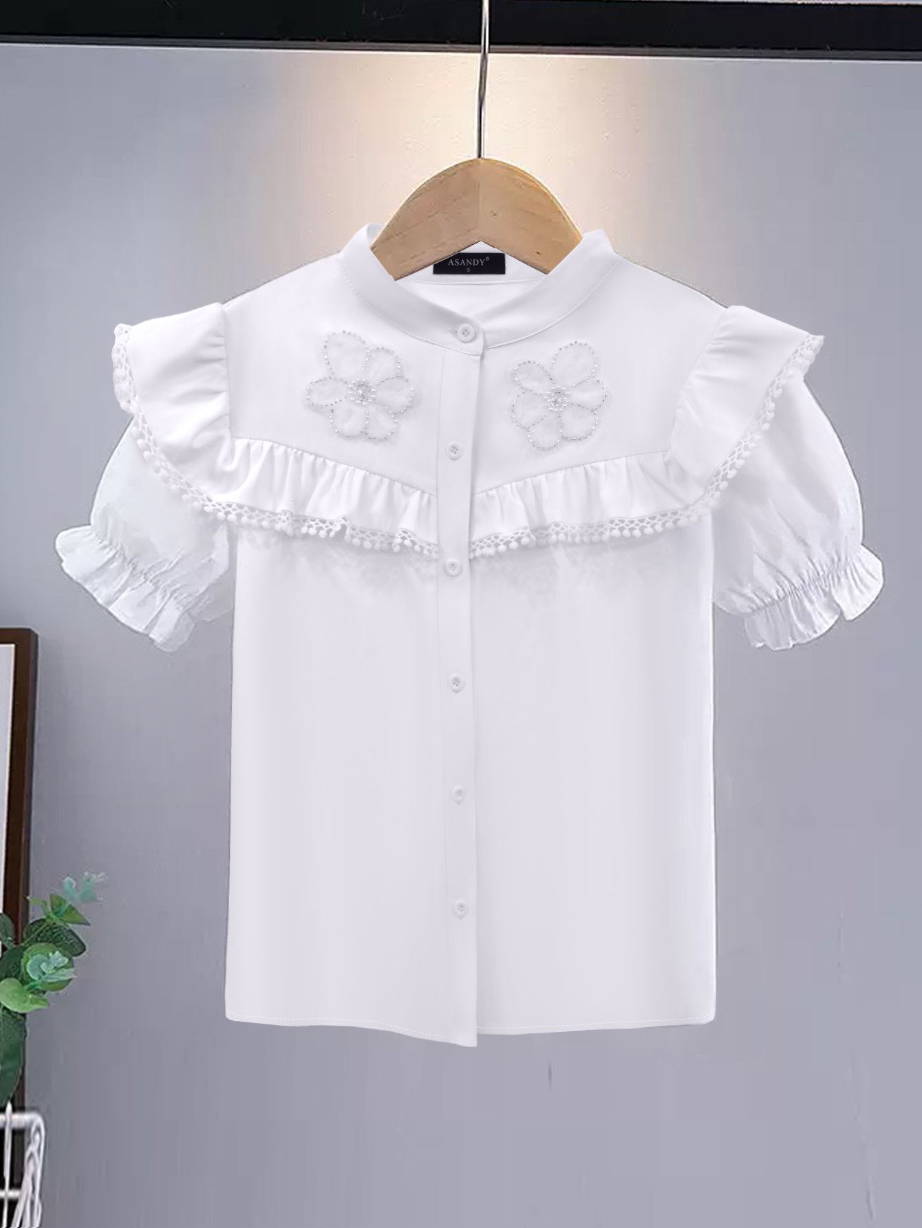 Product Title: Adorable Girls’ White Ruffled Collar Blouse with Floral Appliqué – Perfect for Special Occasions