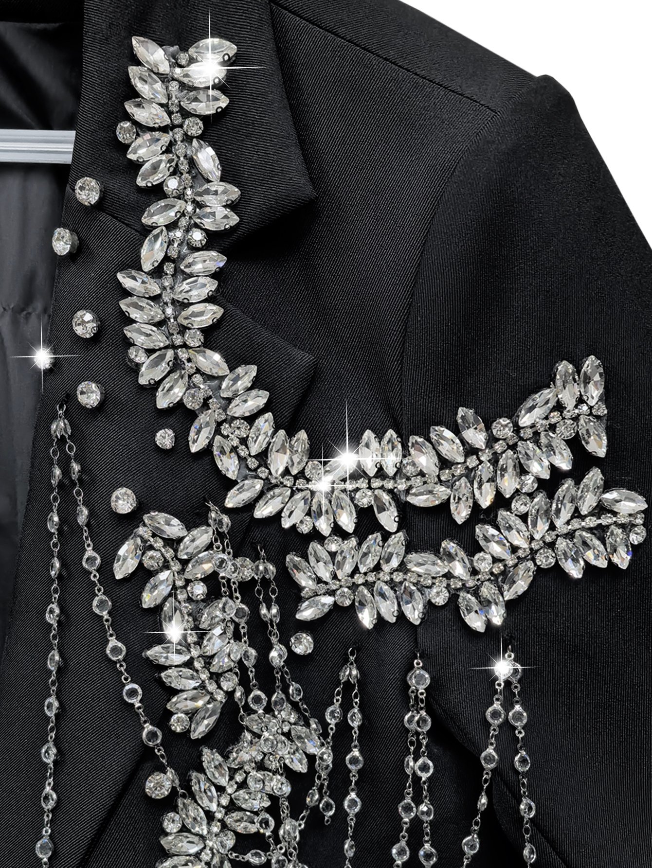 Versatile in its elegance, this white blazer transitions seamlessly from daytime business meetings to evening galas, date nights, or wedding events. Pair it with tailored trousers for a polished office look, a sleek dress for formal occasions, or jeans for a chic casual ensemble—its timeless design and glamorous accents make it a versatile staple in your luxury wardrobe. Every stitch, chain link, and diamond reflects our commitment to craftsmanship, ensuring this blazer becomes a cherished piece for years to come.Versatile in its luxury, this black slim blazer transitions seamlessly from formal galas to chic date nights. Pair it with tailored trousers for a polished power look, a sleek slip dress for red-carpet glamour, or high-waisted jeans for an elevated casual ensemble—its timeless black base lets the fringe and rhinestone details take center stage. The premium fabric ensures durability and a refined drape, while the custom slim fit guarantees a silhouette that stands out from mass-produced pieces. Every stitch, fringe tassel, and rhinestone reflects our commitment to unparalleled craftsmanship, making this blazer a cherished staple in your luxury wardrobe.