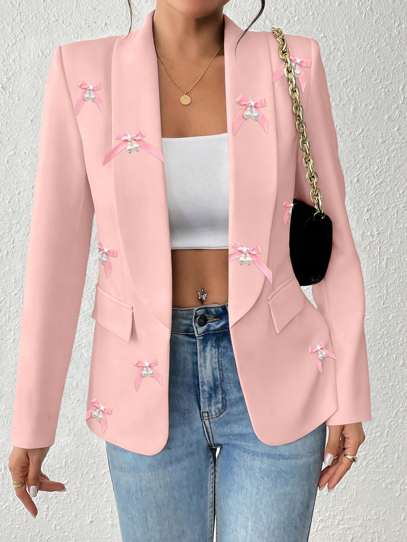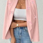 Premium Custom White Blazer for Women – Elegant Chain & Hand-Set Diamond Accents | Luxury Formal OuterwearPremium Custom Pink Blazer for Women – Handcrafted All-Over Bow Details | Luxury Artisanal Outerwear