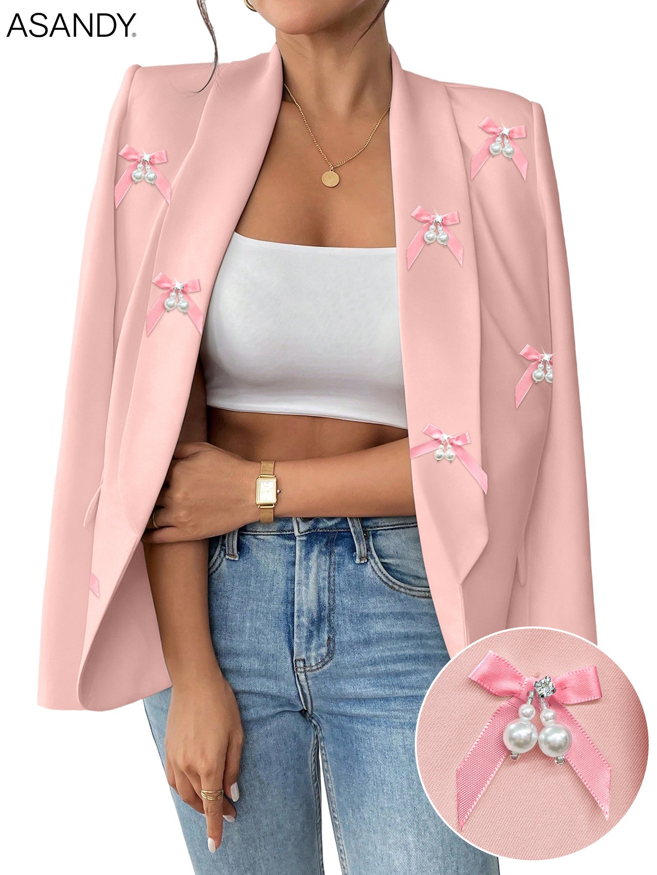 Versatile in its elegance, this white blazer transitions seamlessly from daytime business meetings to evening galas, date nights, or wedding events. Pair it with tailored trousers for a polished office look, a sleek dress for formal occasions, or jeans for a chic casual ensemble—its timeless design and glamorous accents make it a versatile staple in your luxury wardrobe. Every stitch, chain link, and diamond reflects our commitment to craftsmanship, ensuring this blazer becomes a cherished piece for years to come.Versatile in its romance, this pink bow blazer transitions seamlessly from daytime elegance to evening charm. Pair it with a white blouse and tailored pink trousers for a cohesive office look, a flowy midi dress for a whimsical wedding guest ensemble, or high-waisted jeans for a chic casual vibe—its soft pink base lets the intricate bow details take center stage. The premium fabric maintains a refined finish, while the handcrafted bows add a touch of femininity without compromising luxury. Every stitch and bow reflects our commitment to artisanal craftsmanship, making this blazer a cherished staple in your luxury wardrobe.