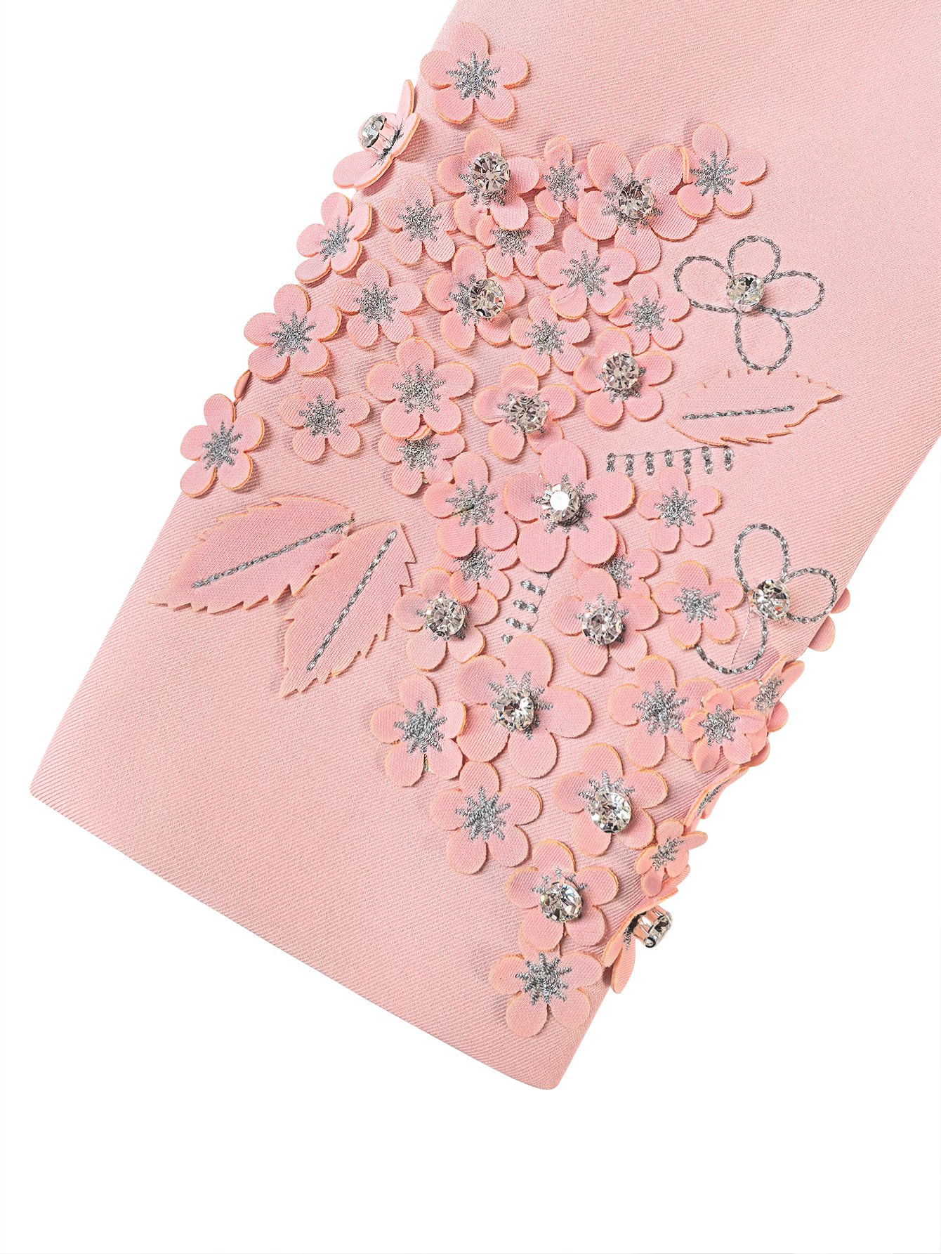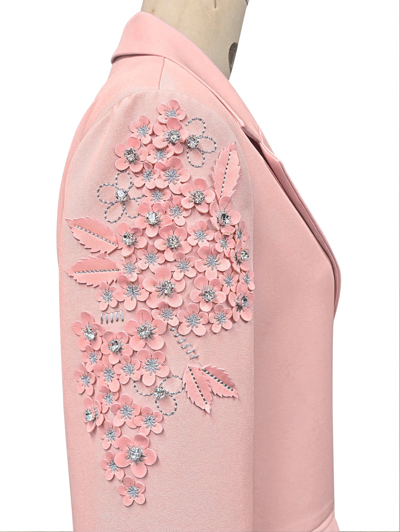 The crisp white outer layer is made from premium, wrinkle-resistant fabric that boasts a smooth texture and impeccable drape, flattering every body shape with its structured yet comfortable silhouette. What elevates this piece is the intricate detailing: delicate metal chains are artfully woven into the design (along the collar, cuffs, and front placket), paired with hand-set diamonds that catch the light from every angle, exuding understated opulence without overstatement. As a custom piece, we tailor each blazer to your unique measurements, ensuring a flawless fit that complements your figure and enhances your confidence.The soft pink outer layer is made from premium, wrinkle-resistant fabric that boasts a silky texture and impeccable drape, flattering every body shape with its structured yet comfortable silhouette. What elevates this piece is the intricate cuff detailing: each flower is entirely hand-sewn by skilled artisans, using high-quality silk and linen blends to create natural, three-dimensional petals. Every stitch is precision-placed to ensure durability, while the floral design adds a touch of soft glamour without overstatement. As a custom piece, we tailor each blazer to your unique measurements, ensuring a flawless fit that complements your figure and enhances your confidence.