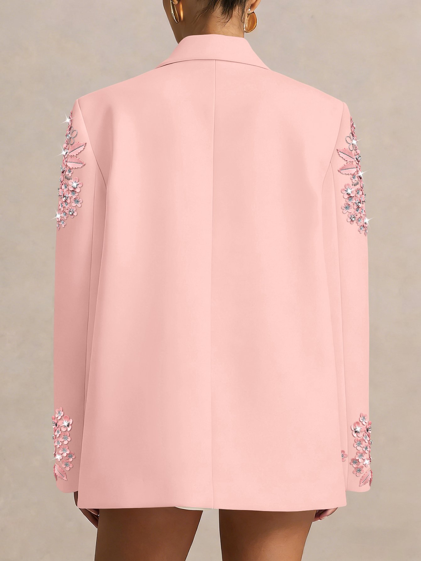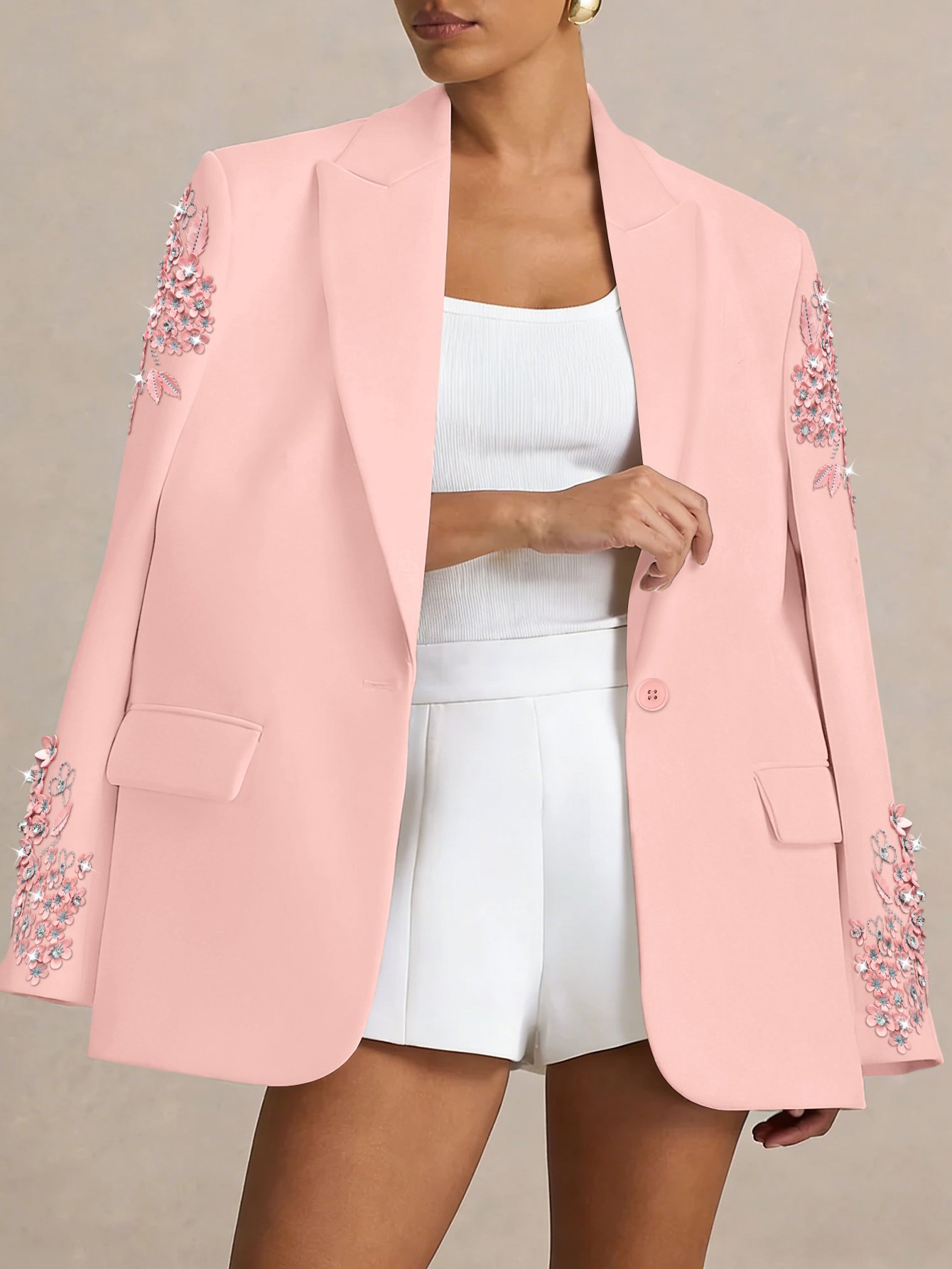 Versatile in its elegance, this white blazer transitions seamlessly from daytime business meetings to evening galas, date nights, or wedding events. Pair it with tailored trousers for a polished office look, a sleek dress for formal occasions, or jeans for a chic casual ensemble—its timeless design and glamorous accents make it a versatile staple in your luxury wardrobe. Every stitch, chain link, and diamond reflects our commitment to craftsmanship, ensuring this blazer becomes a cherished piece for years to come.Versatile in its charm, this pink blazer transitions seamlessly from daytime elegance to evening allure. Pair it with a white blouse and tailored trousers for a polished office look, a flowy dress for a whimsical wedding guest ensemble, or jeans and a tank top for a chic casual vibe—its timeless design and handcrafted floral accents make it a versatile staple in your luxury wardrobe. Every stitch and petal reflects our commitment to craftsmanship, ensuring this blazer becomes a cherished piece for years to come.