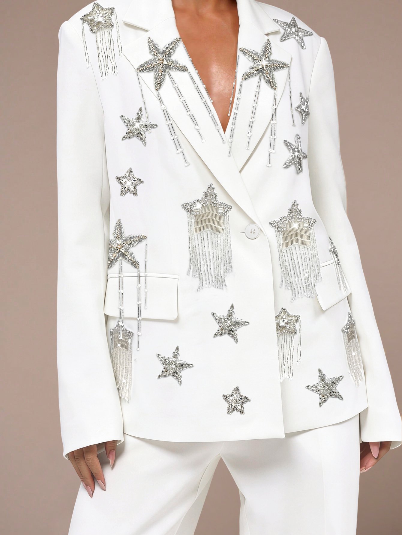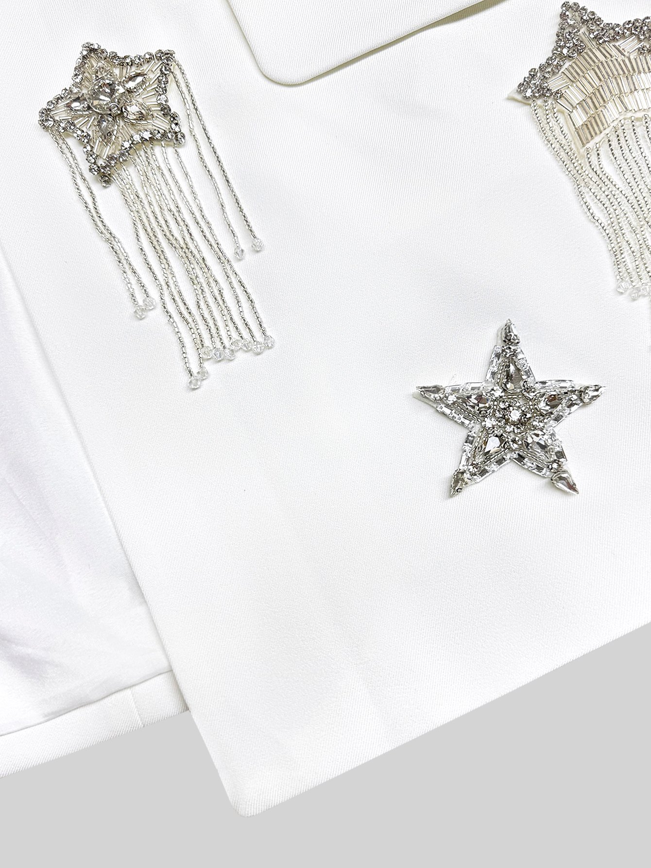 Versatile in its elegance, this white blazer transitions seamlessly from daytime business meetings to evening galas, date nights, or wedding events. Pair it with tailored trousers for a polished office look, a sleek dress for formal occasions, or jeans for a chic casual ensemble—its timeless design and glamorous accents make it a versatile staple in your luxury wardrobe. Every stitch, chain link, and diamond reflects our commitment to craftsmanship, ensuring this blazer becomes a cherished piece for years to come.Versatile in its charm, this white fringe blazer transitions seamlessly from daytime elegance to evening allure. Pair it with a flowy maxi dress for a romantic beach wedding look, tailored white trousers for a polished summer office ensemble, or high-waisted denim for a chic casual vibe—its crisp white base lets the star and starfish fringes take center stage. The premium fabric maintains a refined finish, while the handcrafted fringes add a touch of whimsy without compromising luxury. Every stitch, fringe tassel, and starfish detail reflects our commitment to artisanal craftsmanship, making this blazer a cherished staple in your seasonal wardrobe.