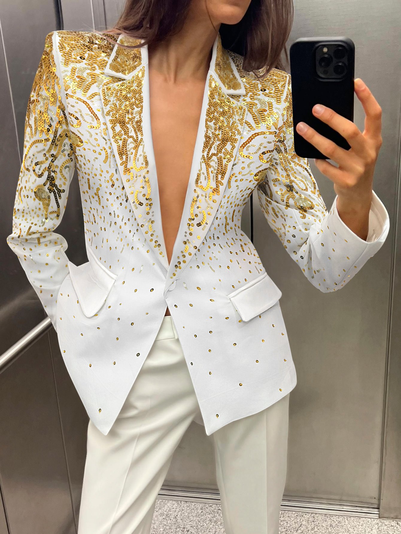High-End Custom Women’s Blazer – Gold Sequin Upper Body & White Base