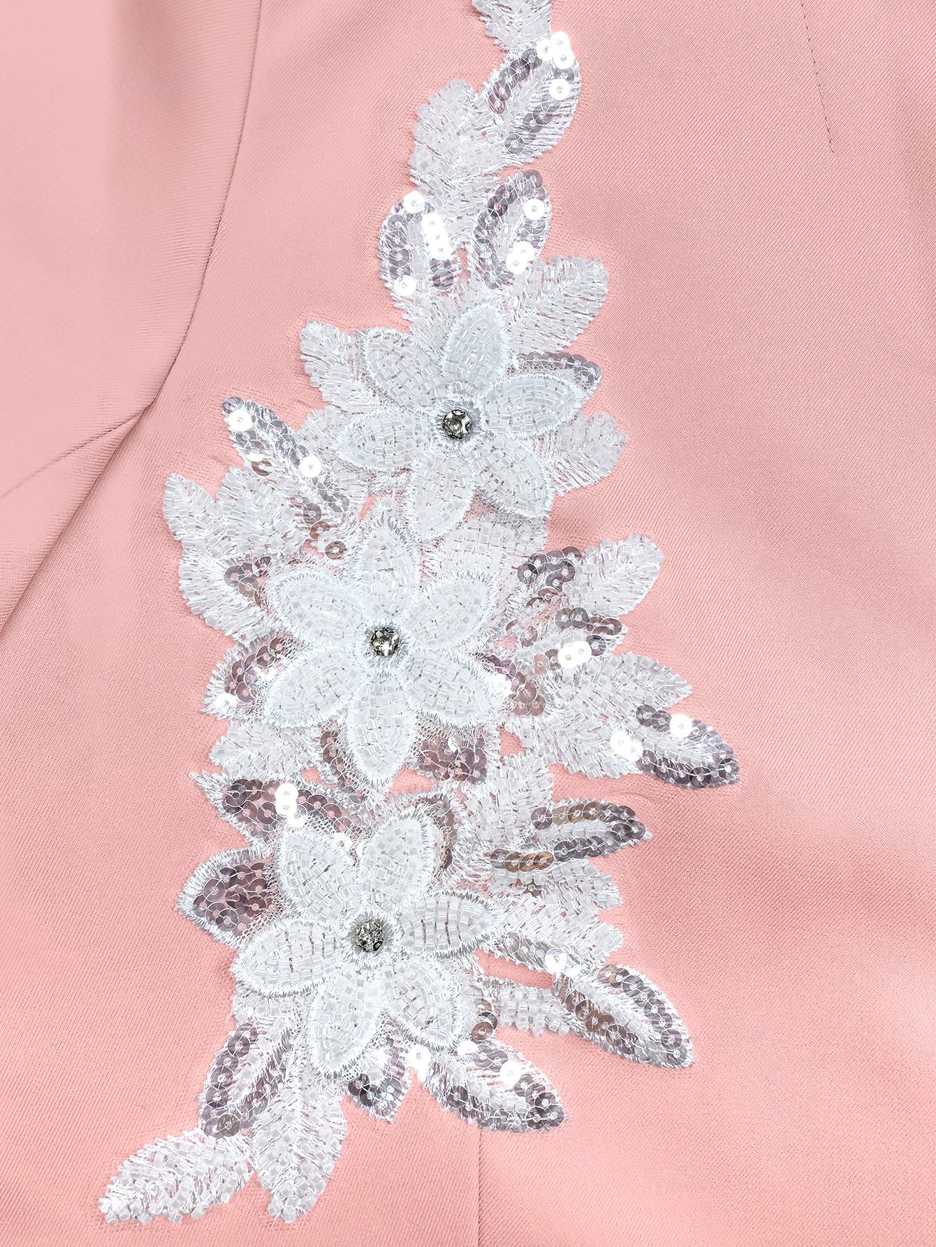 The crisp white outer layer is made from premium, wrinkle-resistant fabric that boasts a smooth texture and impeccable drape, flattering every body shape with its structured yet comfortable silhouette. What elevates this piece is the intricate detailing: delicate metal chains are artfully woven into the design (along the collar, cuffs, and front placket), paired with hand-set diamonds that catch the light from every angle, exuding understated opulence without overstatement. As a custom piece, we tailor each blazer to your unique measurements, ensuring a flawless fit that complements your figure and enhances your confidence.Made from premium fabric adorned with shimmering pink sequins, this blazer boasts a smooth base texture, subtle stretch, and impeccable drape, flattering every body shape with its structured yet comfortable silhouette. The defining charm lies in its artisanal detailing: handcrafted white floral motifs (strategically placed on lapels, cuffs, and front placket) are stitched with precision, creating a harmonious contrast with the pink sequins that catch light from every angle. As an in-stock custom piece, we offer both standard sizes and personalized tailoring for existing inventory, ensuring a flawless fit that complements your figure while avoiding long wait times.