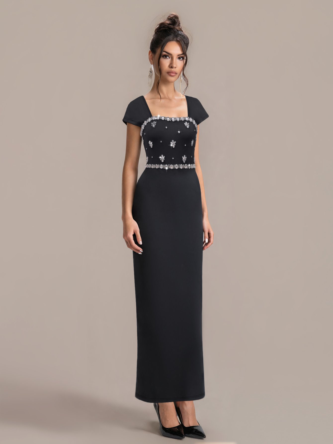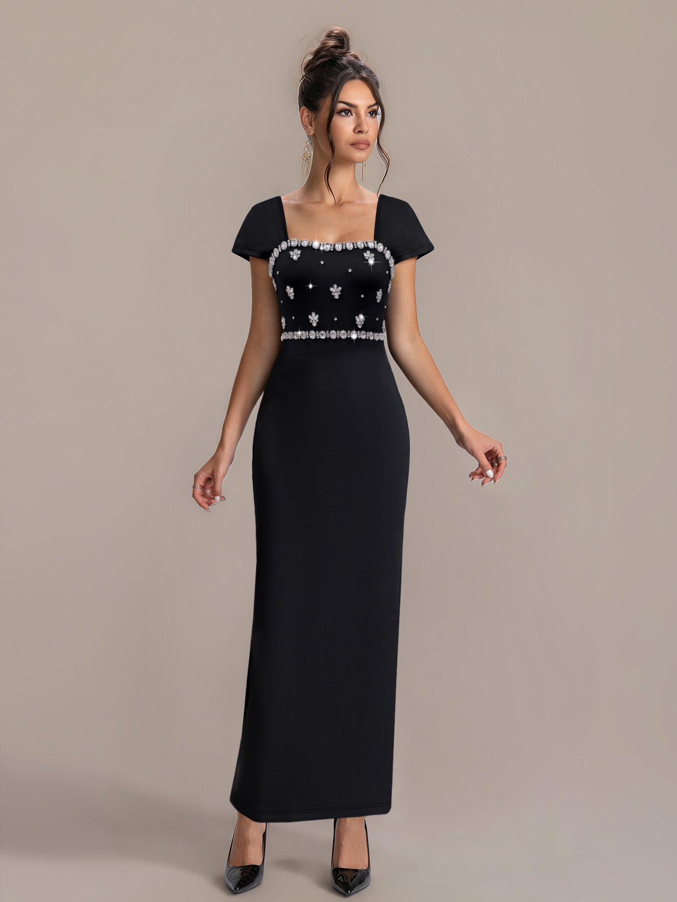 Elevate your evening wardrobe with our Square Neck Pearl Embellished Dress—where classic elegance meets modern sophistication.