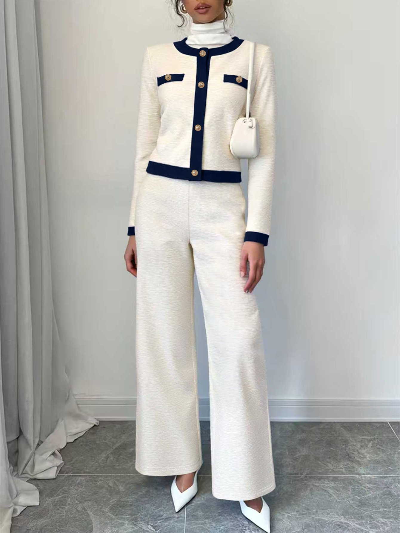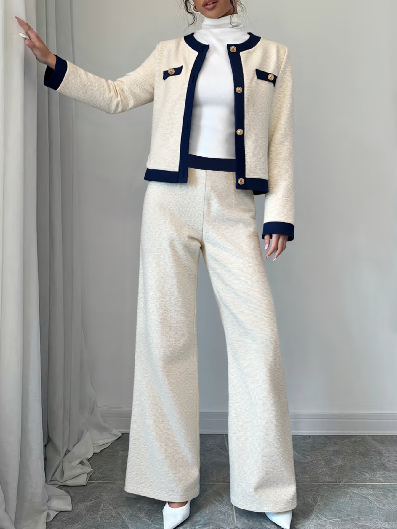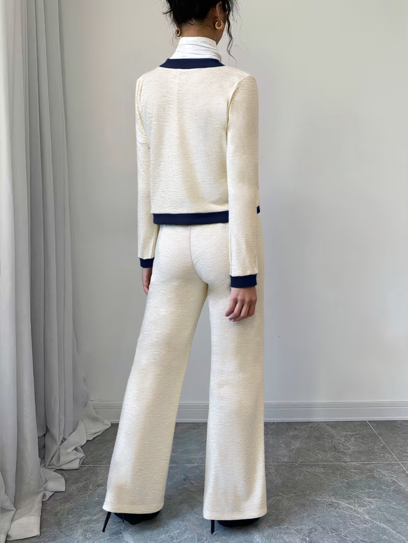 Elevate your luxury wardrobe with this Chanel-inspired tweed set, a masterpiece of high-end custom craftsmanship and timeless elegance. Crafted from premium woven tweed fabric, the set features a sleek collarless design adorned with delicate navy blue lace trims, blending vintage charm with modern minimalism. Tailored for discerning ladies, this two-piece ensemble exudes understated luxury, seamlessly transitioning from formal gatherings to refined daily wear.